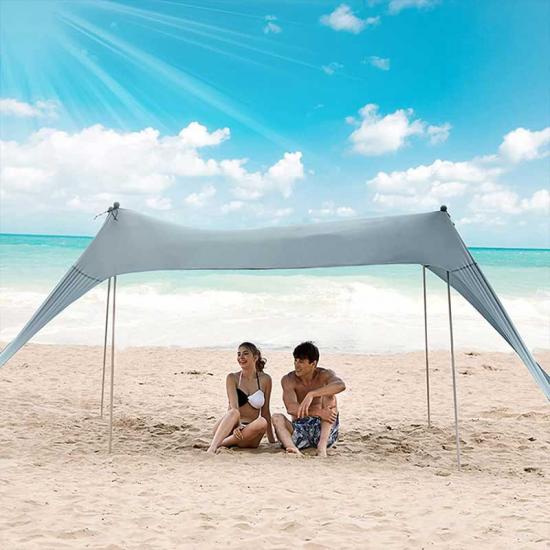 Simply adjust the sand anchors or poles to change the shade angle for optimal shading. Included in the Beach Sun Tent Kit: 4 packs of ground stakes, 4 packs of poles, 4 packs of bungee cords, 1 pack of beach shelter tents, 1 pack of lightweight carrying cases and installation instructions. Reinforcing poles with elastic cords to prevent movement, ground stakes, and refillable punching bag anchors further stabilize the pop-up waterproof shelter. The lightweight Lycra Beach Umbrella comes with a travel carry bag to organize your shade kit.