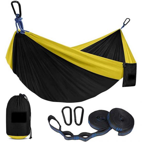 The Nylon hammock comes with two 9ft wooden straps and a carabiner for easy placement. It also has 5 individual rings so you can adjust it to the perfect height. Built to withstand up to 400 pounds with a single hammock and up to 500 pounds with a double hammock, our heavy duty camping hammock features with triple interlocking stitching, sturdy carabiner and tree-friendly hammock straps. The hammock is machine washable. We recommend that you remove the carabiner first to avoid damaging the washing machine. Then, add a very small amount of soap and gently wash with lukewarm water, then wash separately.