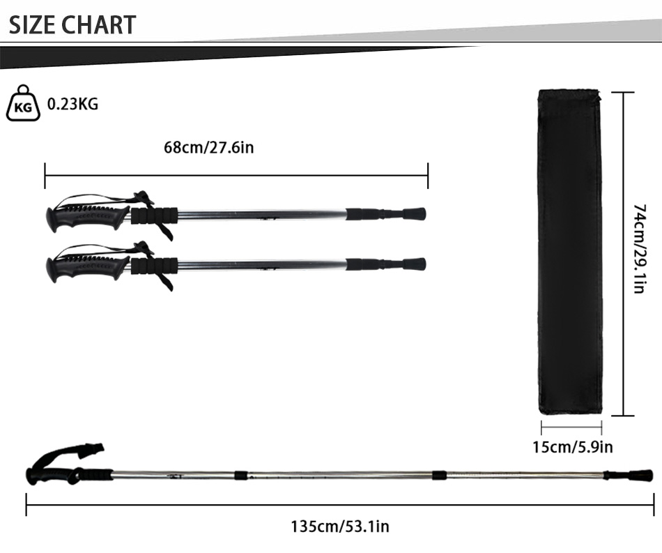 Outdoor telescopic aluminum alloy walking poles are designed to deliver dependable support, comfort, and portability for hiking, trekking, and everyday outdoor activities. Made from lightweight yet durable aluminum alloy, these poles reduce fatigue while maintaining excellent strength and stability on various terrains. The telescopic design allows easy height adjustment to suit different users and trail conditions, while the reliable inner lock mechanism ensures secure length fixing during use. A comfortable rubber handle provides a firm, non-slip grip, improving control and reducing hand strain during long walks. Compact and easy to carry when collapsed, these walking poles are ideal for travel, fitness walking, and outdoor exploration. Suitable for beginners and experienced users alike, they offer a practical balance of performance, durability, and ease of use for active lifestyles.