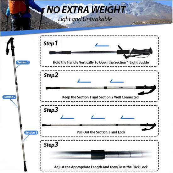ProductOutdoor telescopic aluminum alloy walking poles feature a lightweight design, durable inner lock system, and comfortable rubber handle, providing reliable support for hiking, trekking, and everyday outdoor walking.