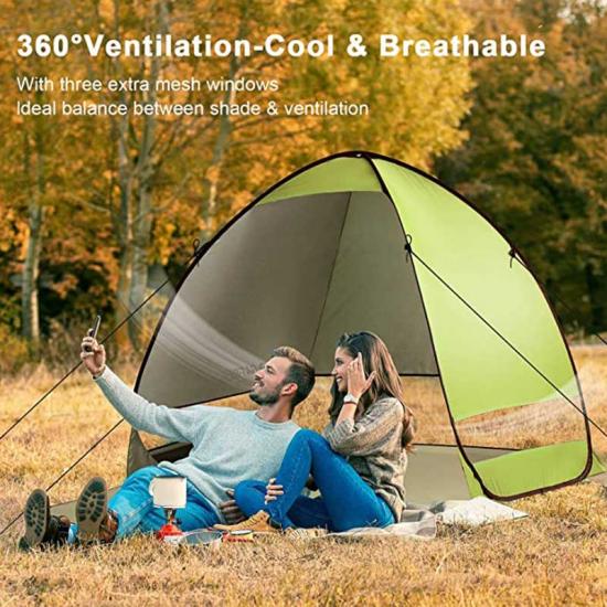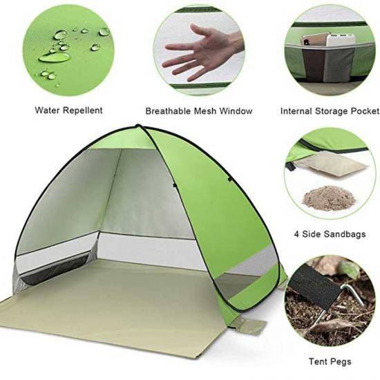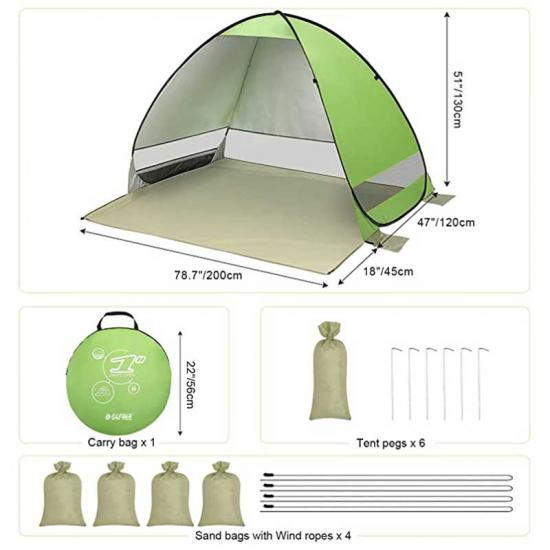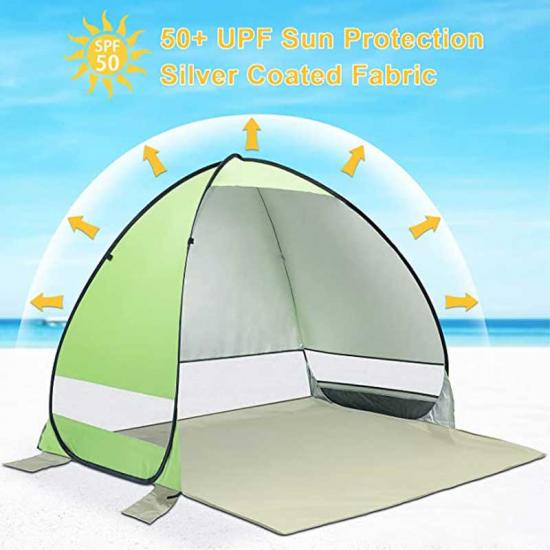With the material of silver-plated fabric, and the beach tent withUPF50 + guarantees an anti-UV coverage area could keep the sun from our skin. All materials are non-toxic, odorless and manufactured to international standards, making them safe for adults and children to use. No need time and effort to assembly it. The patented structure moves up and down in seconds. Keep children and other fragile objects away from the tent when you are ready to open it.