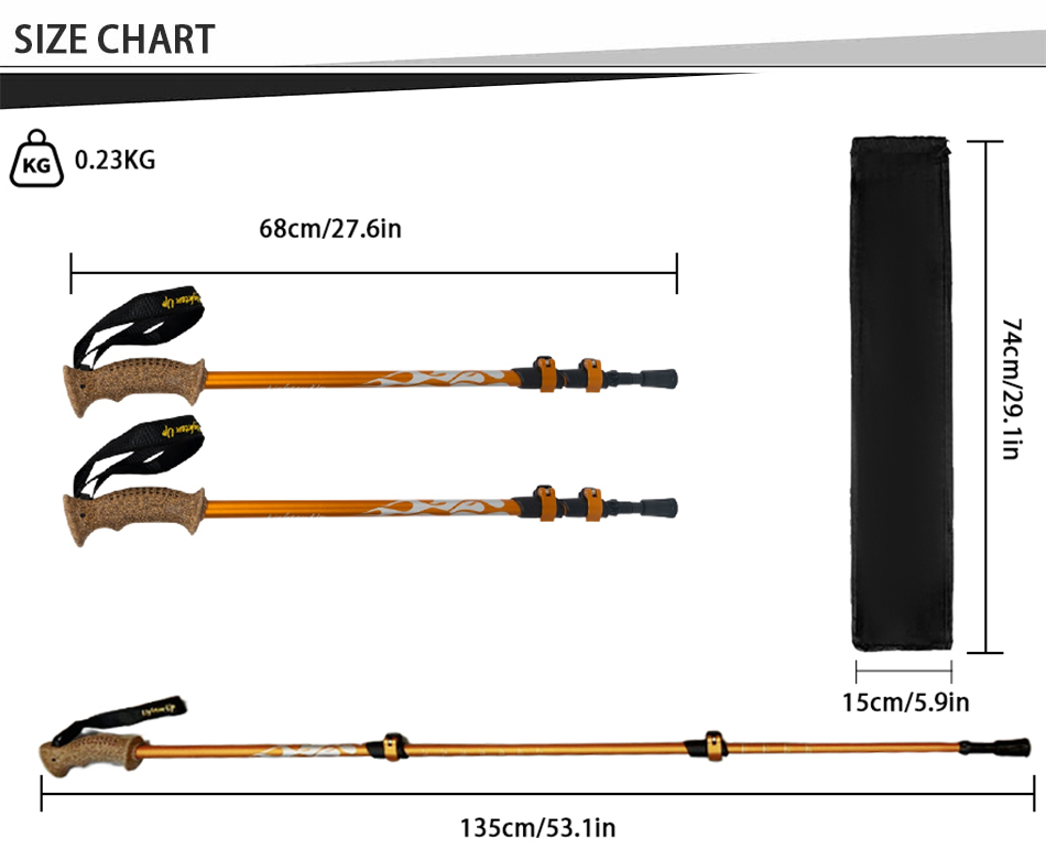 Portable adjustable aviation grade aluminum trekking poles are designed to provide dependable support, comfort, and durability for active walking, trekking, and outdoor exploration. Constructed from high-strength aviation-grade aluminum, these poles deliver excellent stability while remaining lightweight enough to reduce arm and shoulder fatigue during long-distance use. The adjustable telescopic design allows users to easily customize the height for different terrains and personal preferences, ensuring proper posture and balance. Featuring comfortable rubber handles, the poles offer a secure, non-slip grip that performs well in various weather conditions. Durable tip accessories enhance traction on dirt, gravel, pavement, and rocky trails, improving safety and control. Ideal for hiking, fitness walking, and travel, these trekking poles combine portability, strength, and versatility for reliable outdoor performance.