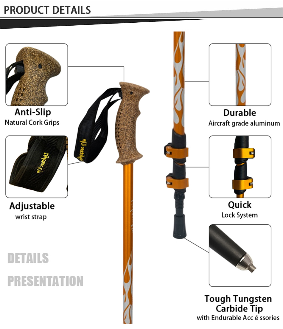Brand: ANHUI FEISTEL FACTORY Relate Manufacturing: OEM & ODM Product: Lightweight and durable hiking trekking pole made from 7075 duralumin aluminum. Provides stability, shock absorption, and adjustable height for comfortable walking on all terrains.