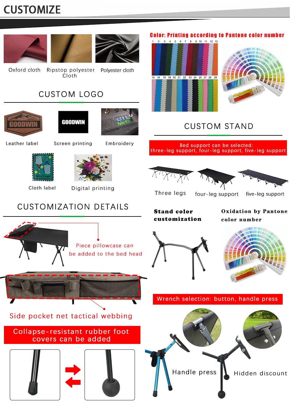 Product name: Camping Portable Bed Outdoor Materials: 600d oxford cloth, aluminum alloy MOQ:100PC Price: contact us via email
