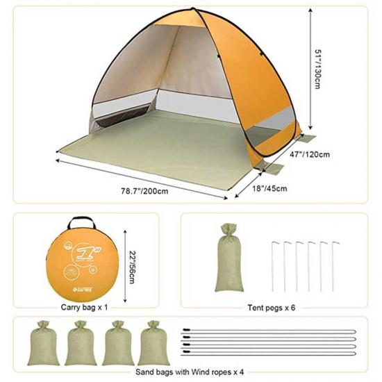 With the windproof and practical design, the camping beach tent will protects you from the summer breeze. Besides,the external sandbags and nails hold the tent firmly against the ground. With the windproof and practical design, the camping beach tent will protects you from the summer breeze. Besides,the external sandbags and nails hold the tent firmly against the ground.The tent is specially designed to be lightweight and easy to carry. you can easily carry your tent to the beach or park by packing it in a small bag.