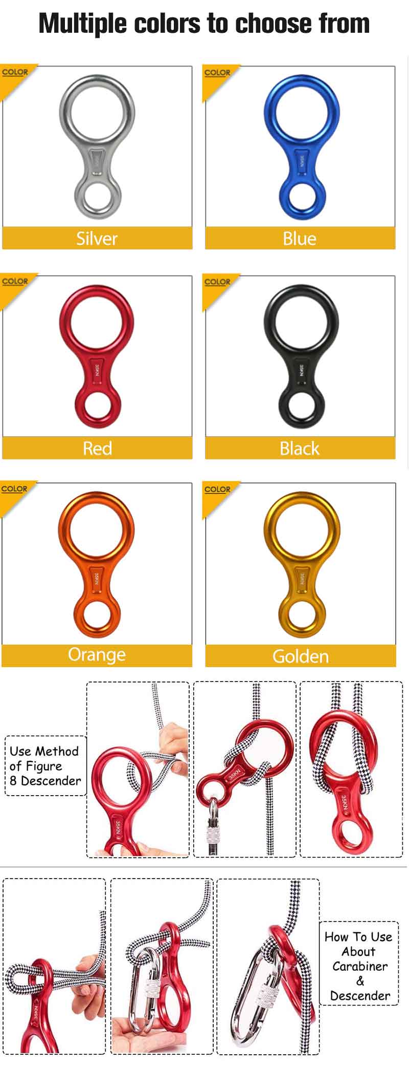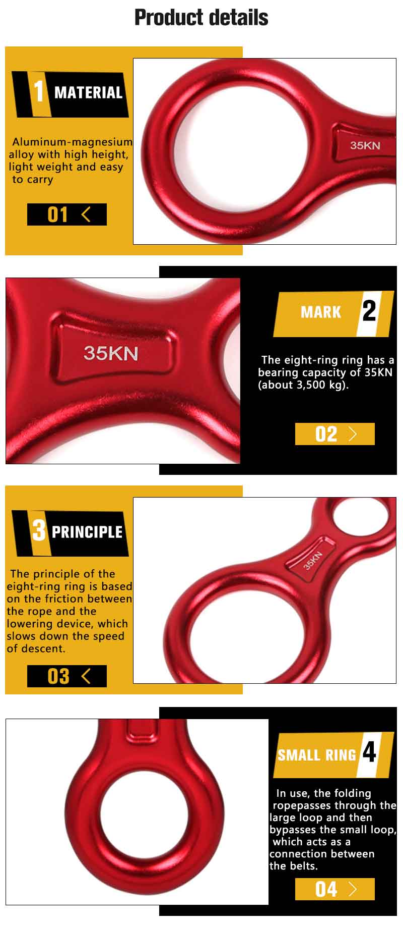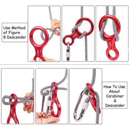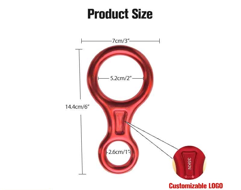1) Carabiners Material-Aluminum- magnesium alloy with high height, | light weight and easy to carry 2) Mark-The eight-ring ring has a bearing capacity of 35KN (about 3,500 kg).