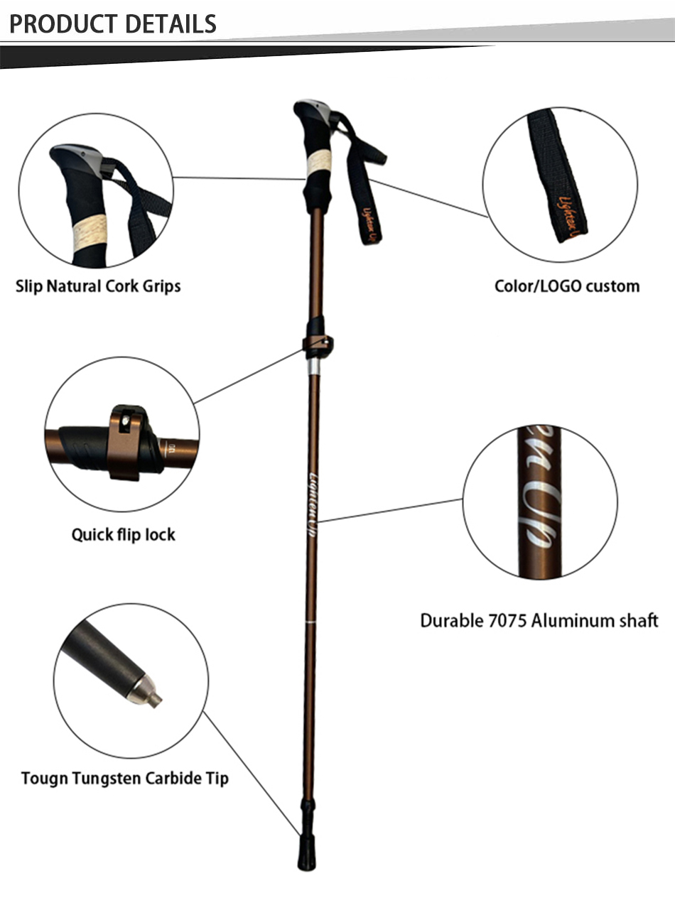 Brand: ANHUI FEISTEL FACTORY Relate Manufacturing: OEM & ODM Product: Collapsible lightweight trekking poles with natural cork grips, flip-lock adjustment, anti-slip tips, shock absorption, durable design, includes carry bag, ideal for hiking, walking, and running adventures.