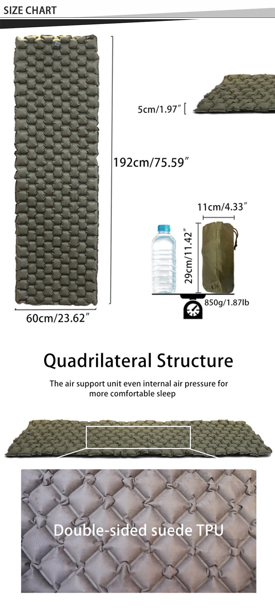 Product: This ultralight double-sided suede waterproof TPU inflatable camping sleeping pad offers superior comfort, durability, and portability, making it perfect for outdoor adventures, hiking, and backpacking trips.