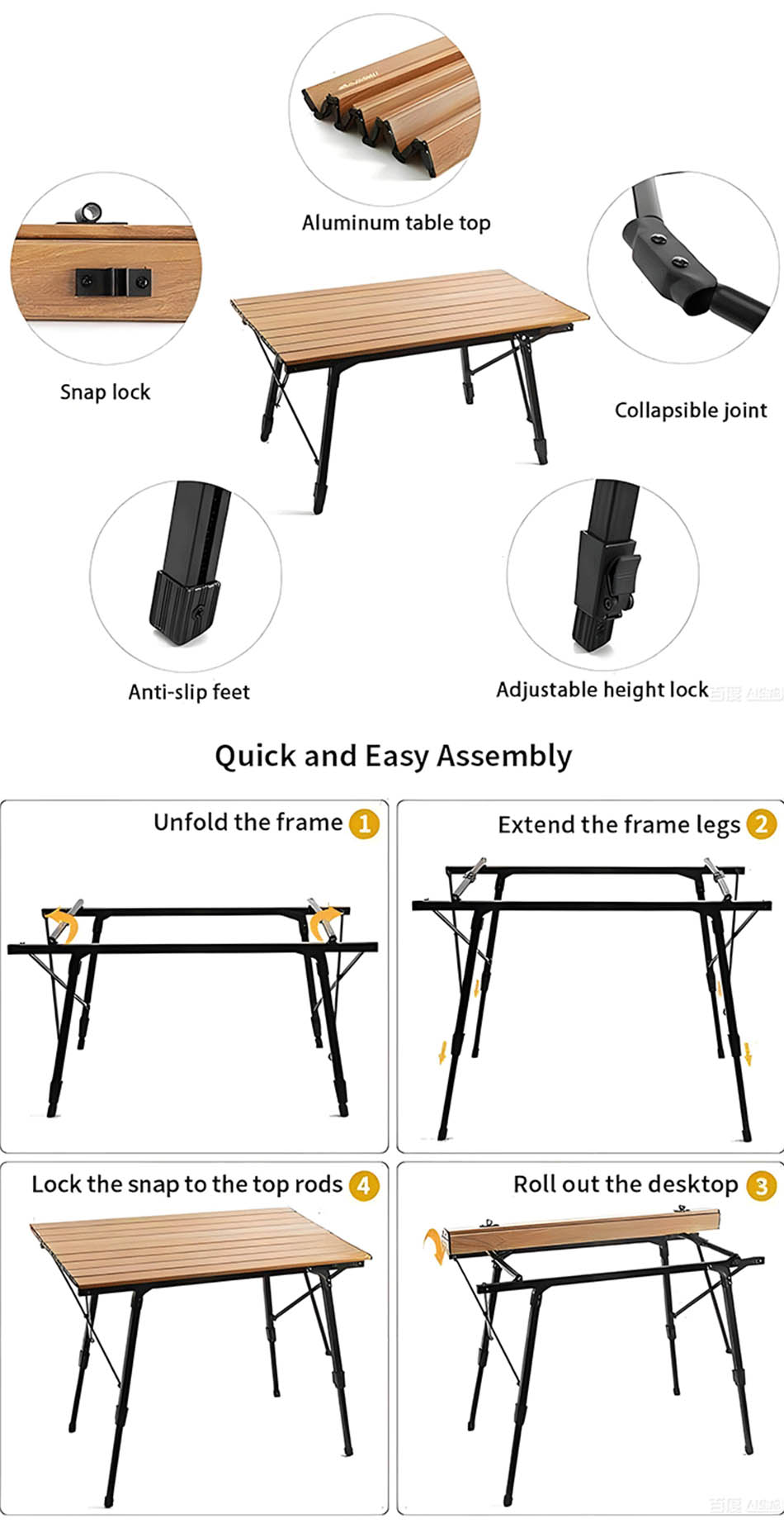 Brand: ANHUI FEISTEL FACTORY Relate Manufacturing: OEM & ODM Product: Outdoor Portable Folding Roll Up Picnic Table: Lightweight, durable aluminum design with adjustable height, easy setup, and compact carry bag for camping, picnics, and outdoor activities.
