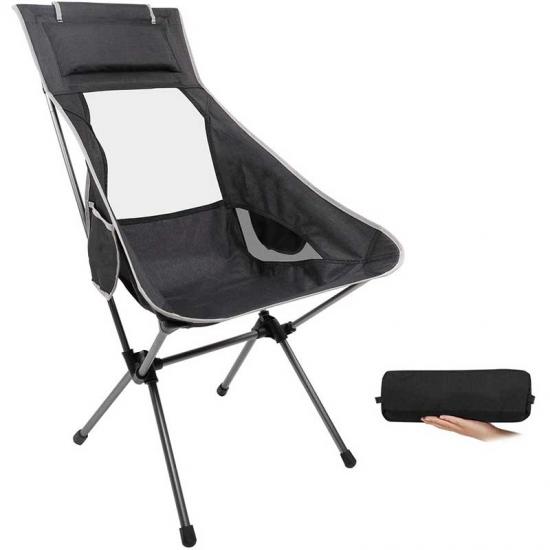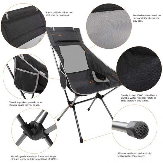 The camping chair is made of sturdy aluminium frame and high quality 600D Oxford cross. It is very convenient to use. Great for backpackers, hikers, campers, adventurers and those who don't like bulky items.You can fully relax your back, with the top sponge cover pillow firmly supporting your head
