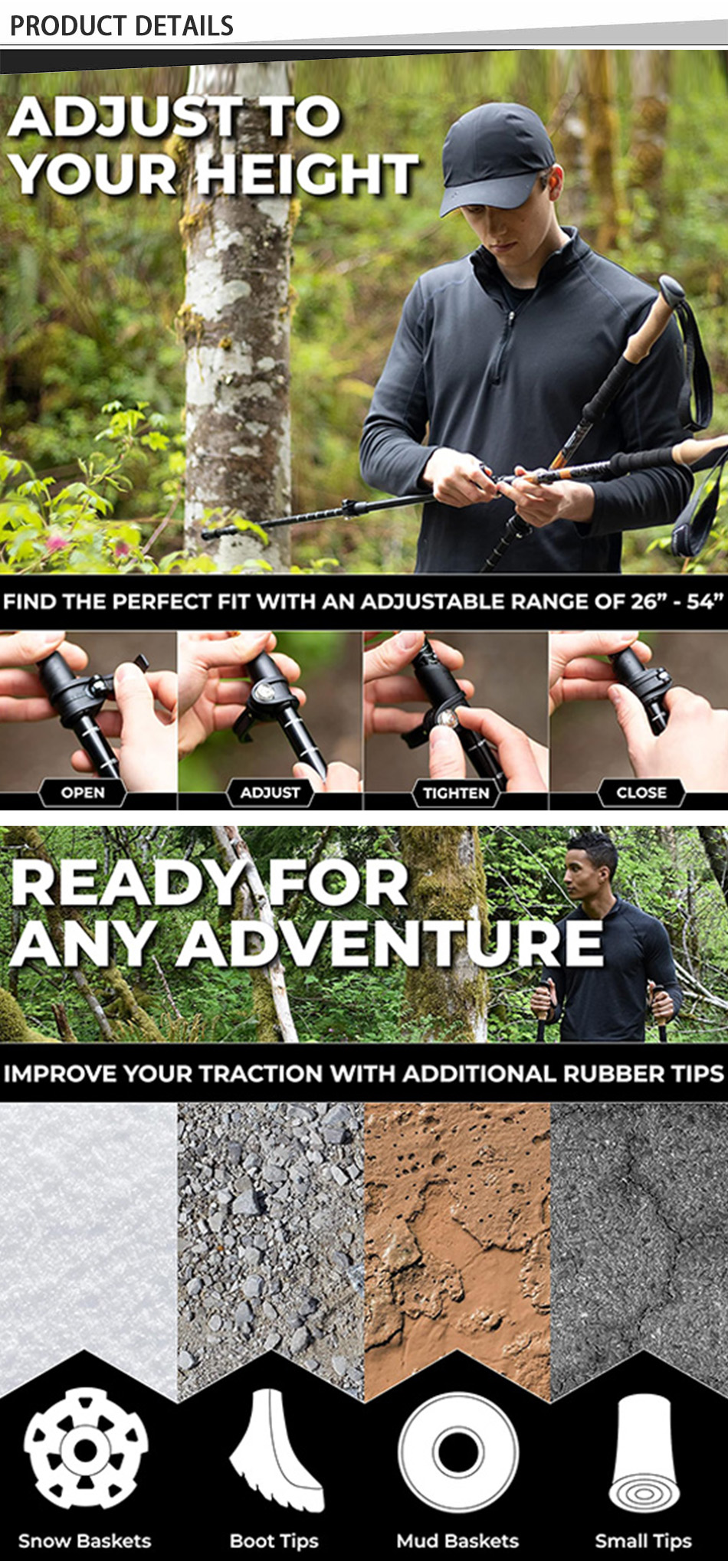 Brand: ANHUI FEISTEL FACTORY Relate Manufacturing: OEM & ODM Product: Ultralight adjustable aluminum trekking poles with carbon construction, ergonomic handles, shock absorption, durable tips, foldable design, ideal for hiking, climbing, walking, OEM wholesale, Amazon bestseller.